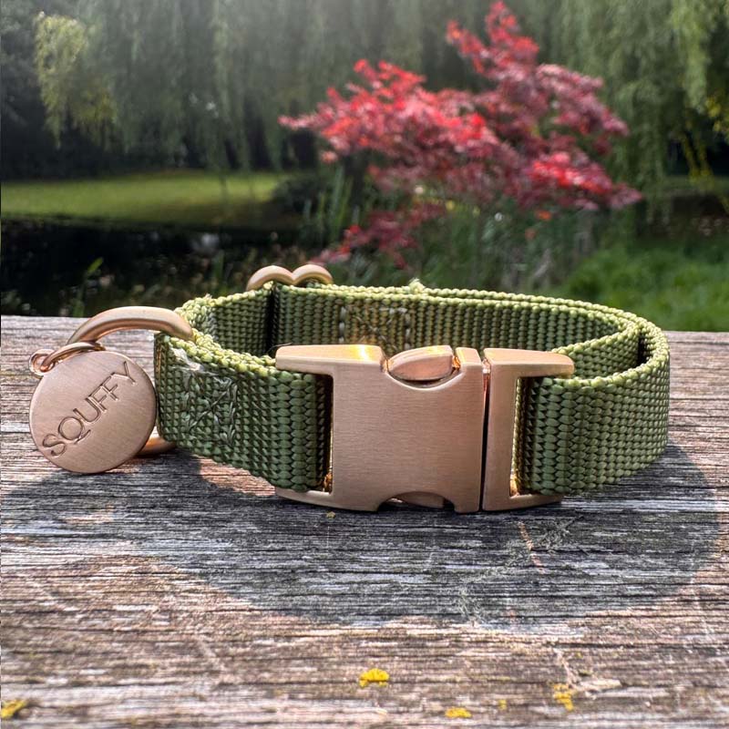 It allows for sleek, polished finishes (like gold tones!) while remaining rust-resistant and comfortable for your dog to wear. It’s also lighter than steel or brass, making it ideal for daily use.